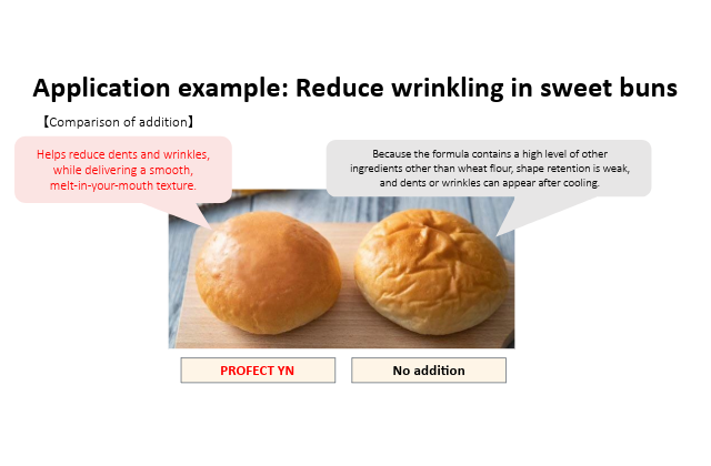 "PROFECT YN", with our unique modified peptide technology, improves dough extensibility and flexibility, leading to better workability, higher yields, and a more consistent product appearance. It addresses a range of manufacturing challenges.