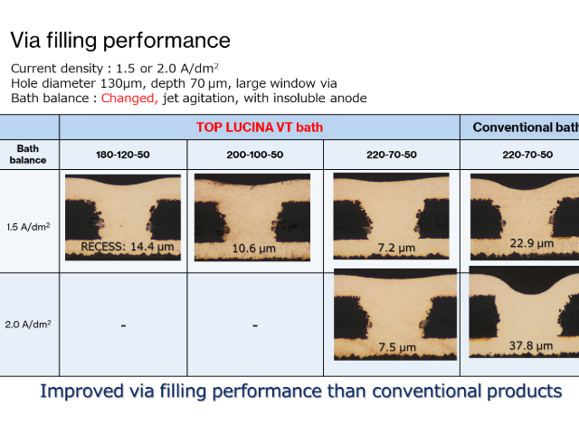 TOP LUCINA VT is the best additive for build-up PWBs with via and through holes. With general copper sulfate plating additives, it is necessary to increase the sulfuric acid concentration in the plating bath to ensure throwing power in the through-holes, Such high throwing bath compositions can't fill vias sufficiently.