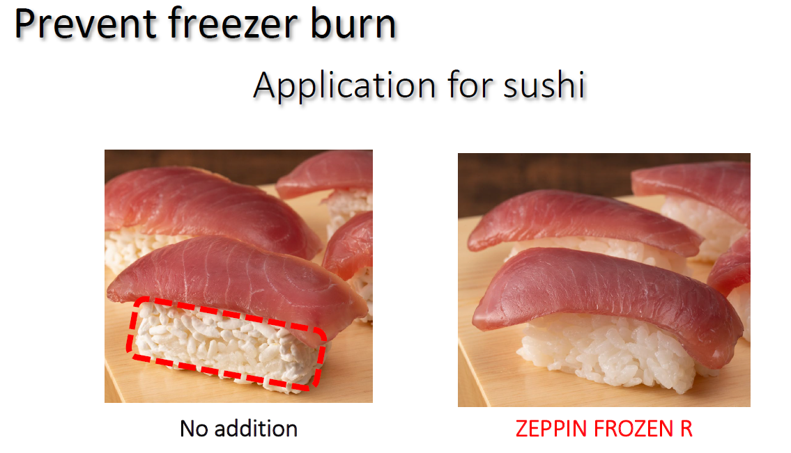 When white rice is frozen after cooking, freezer burn occurs. Freezer burn occurs when frozen foods dehydrate and the outer layers lose moisture after freezing and thawing. It can greatly suppress freezer burn in frozen sushi and frozen seasoned rice by simply adding it to the rice during cooking.